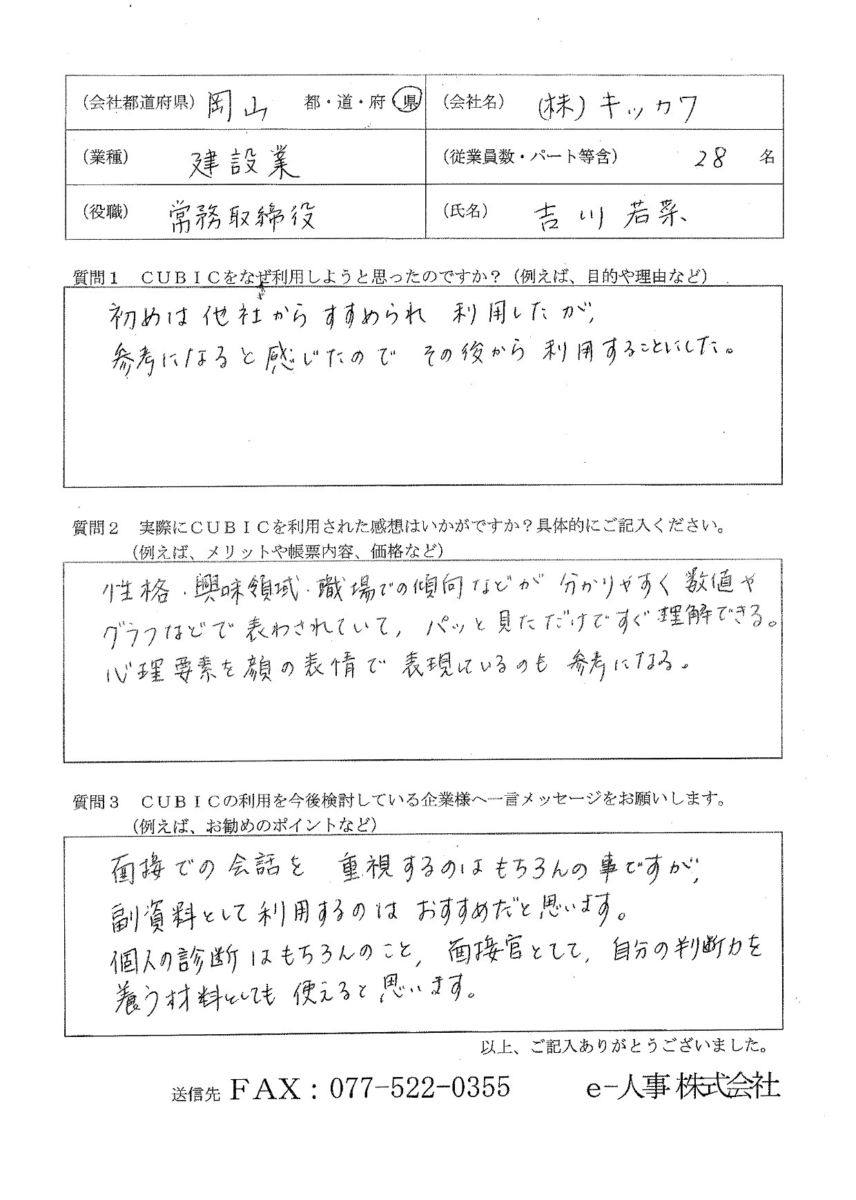 診断結果について、大変嬉しいお言葉をありがとうございます。面接での会話も重視しつつ、CUBICを補助資料としてお役立ていただけましたら幸いです。貴重なご意見ありがとうございました。e-人事㈱スタッフ