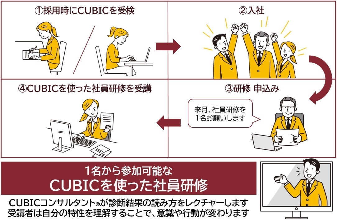 CUBICコンサルタントが自己分析シートの読み方をレクチャーし、受講者が自分の特性や行動を自覚するためのワークを行います。研修はZOOMを使用してオンラインで行います。